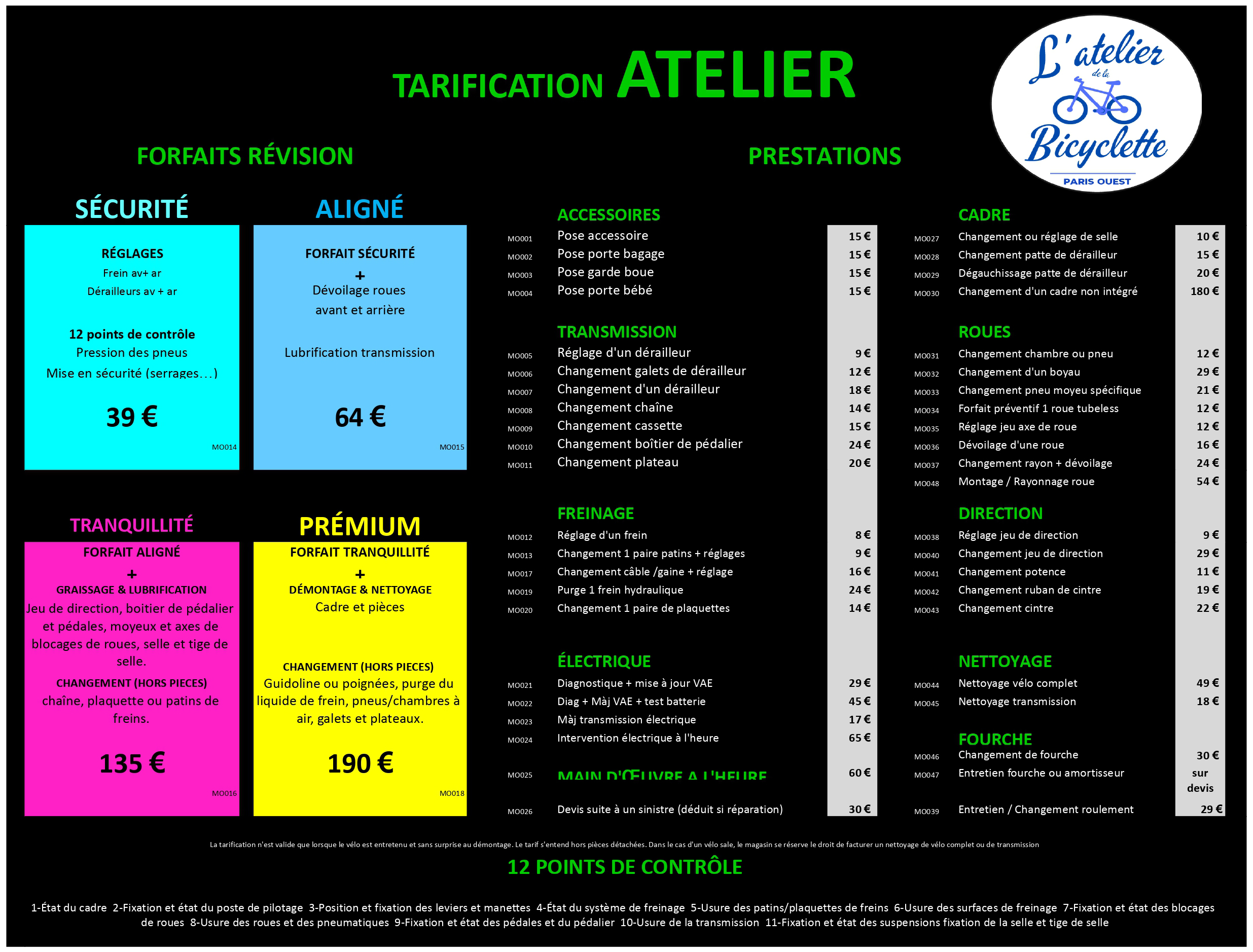 - Remplacement de chambre à air ou pneu : 12€